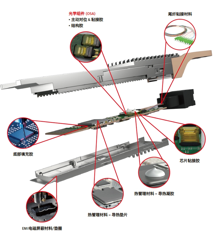 为了实现高速数据传输和高带宽应用,光模块、光学开关和光器件等光通信设备必须将最大量的光传送到光纤中。胶粘剂产品组合可用于芯片粘接、光器件装配、模块装配、透镜粘合、密封、光路和光纤粘接等应用,提供灵活的固化方式和加工适应性。